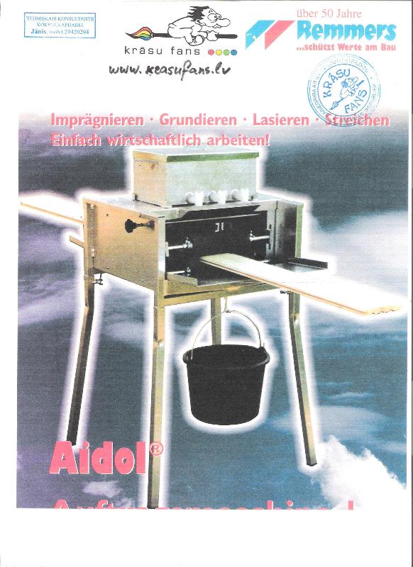 Uz īri un pārdodu kompaktus krāsojamos aparātus , palīgierīces ar rokas padevi. Apšuves dēļu krāsošanai, imprignēšanai, gruntēšanai ar šķidrām Remmers krāsām : HK LASUR, Aqua HSL/35m, GW310 utt.